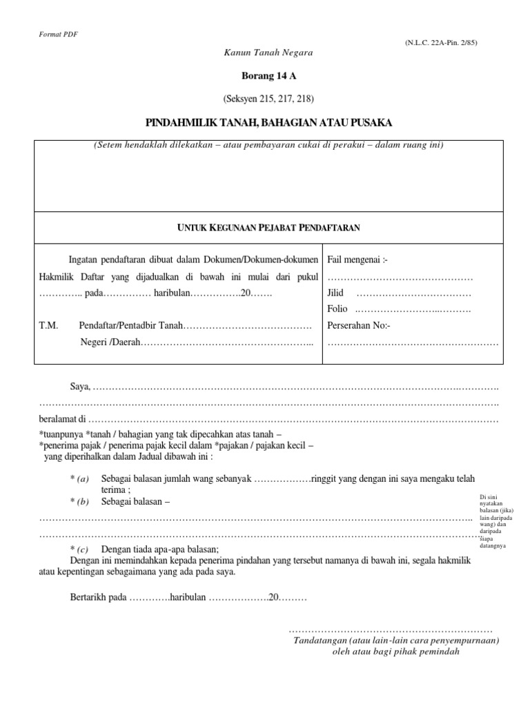Borang 14a Pindah Milik Tanah Bahagian Atau Pajakan Nlc22a Pnmb2u