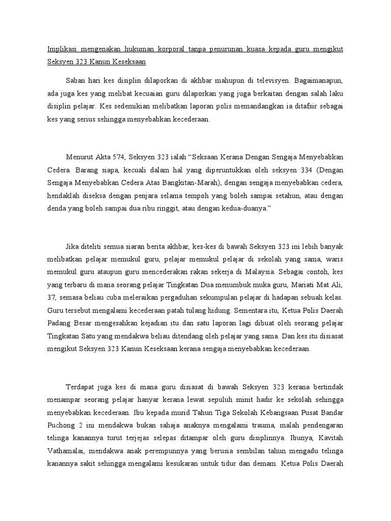 Implikasi Mengenakan Hukuman Corporal Tanpa Penurunan Kuasa Oleh Guru Mengikut Seksyen 320 Dan 323 Kanun Keseksaan