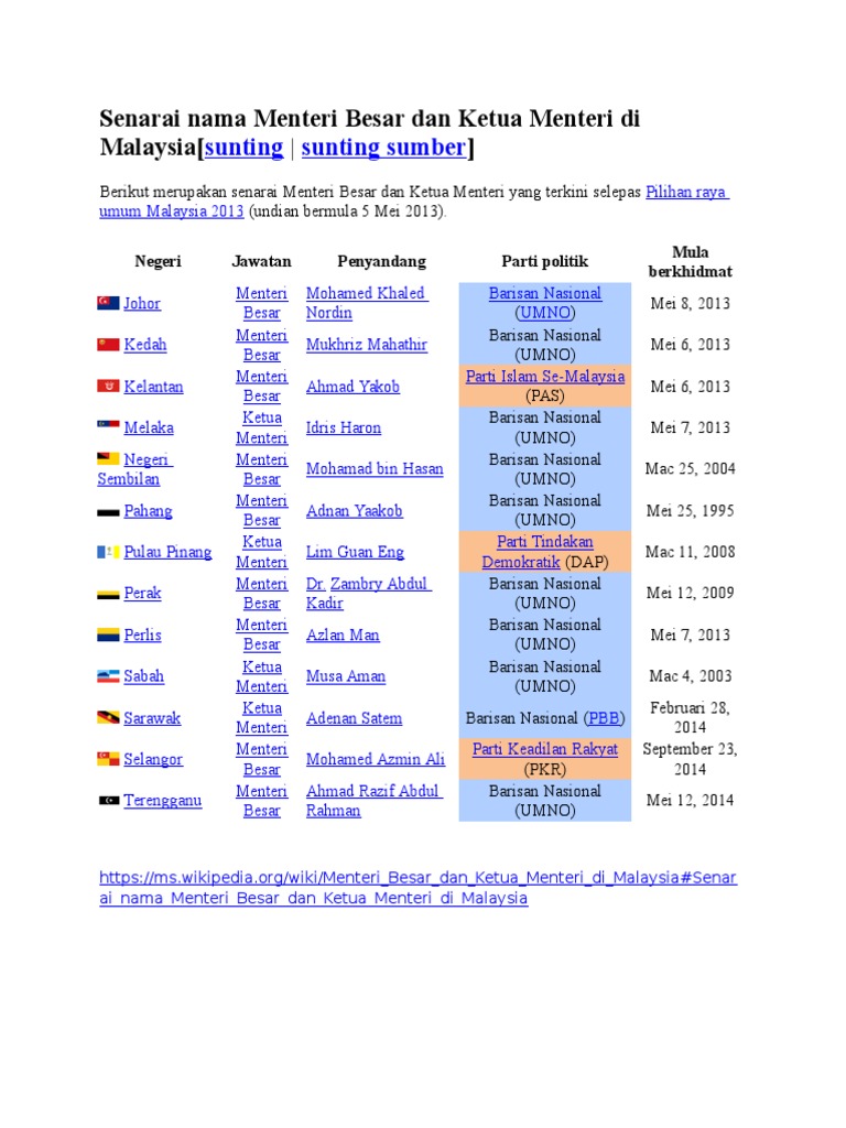Senarai Nama Menteri Besar Dan Ketua Menteri Di Malaysia
