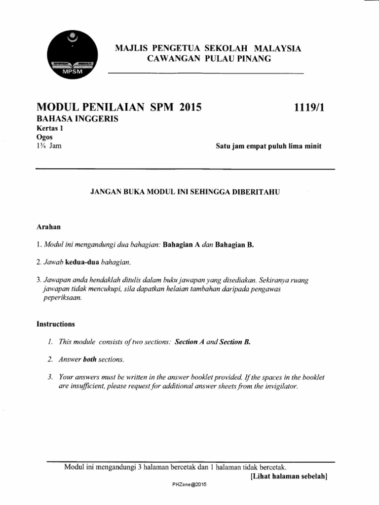 2015 Peperiksaan Percubaan Bahasa Inggeris Spm Pulau Pinang Kertas 1