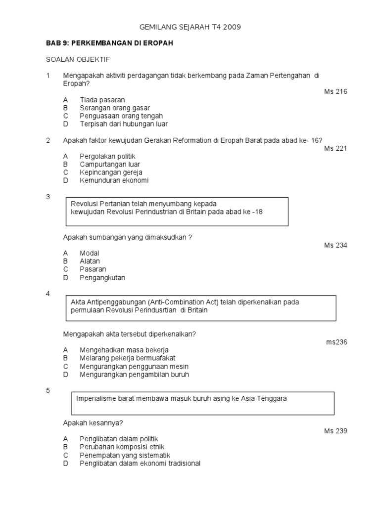 Soalan Objektif Sejarah Tingkatan 4 Bab 4 Dan Jawapan Kerja Kosp