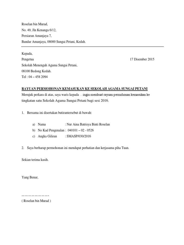 Surat Rayuan Ke Smk Agama Baling