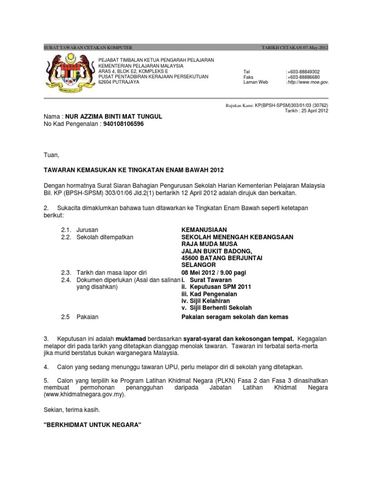 Surat Tawaran Form 6