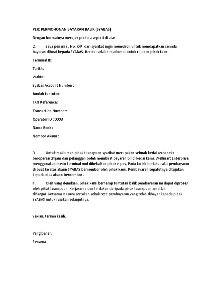 Surat Rasmi Permohonan Bayaran Balik Persoalan M